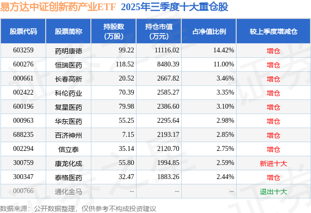 从基金规模来看,易方达中证创新药产业ETF基金2025年三季度公布的基金规模为7.71亿元,较上一期规模4.4亿元变化了3.31亿元,环比变化了75.34%。该基金最新一期资产配置为:股票占净值比99.55%,无债券类资产,现金占净值比0.55%。从基金持仓来看,该基金当季前十大股票仓位达48.94%,第一大重仓股为药明康德(603259),持仓占比为14.42%。